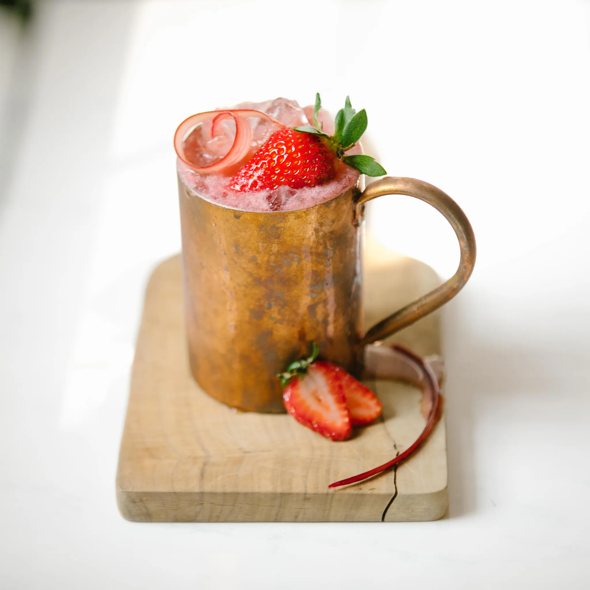 - Top with ginger beer and garnish with sliced strawberries and ribbon of fresh rhubarb. Enjoy!