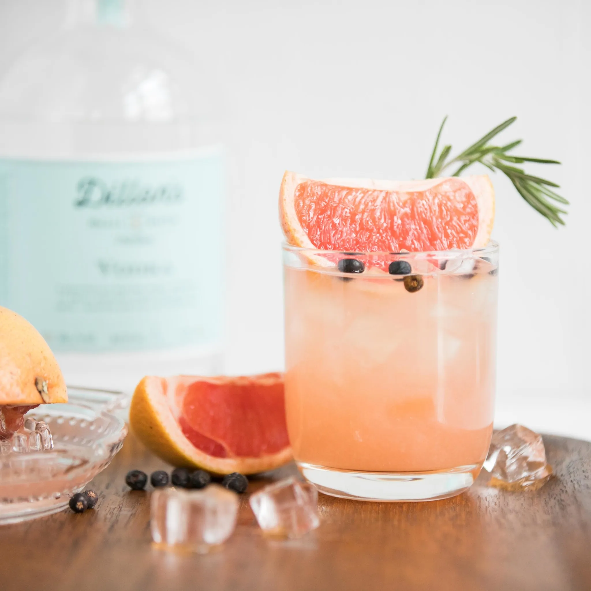 - Top with soda water and garnish with juniper berries, fresh rosemary sprig and grapefruit wedge.