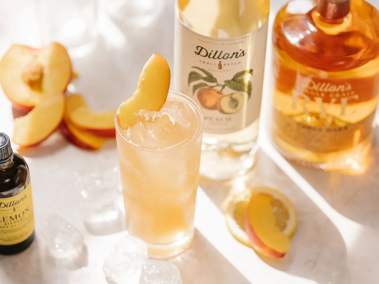 - Strain into a Collins glass filled with fresh ice & garnish with fresh peach slice.